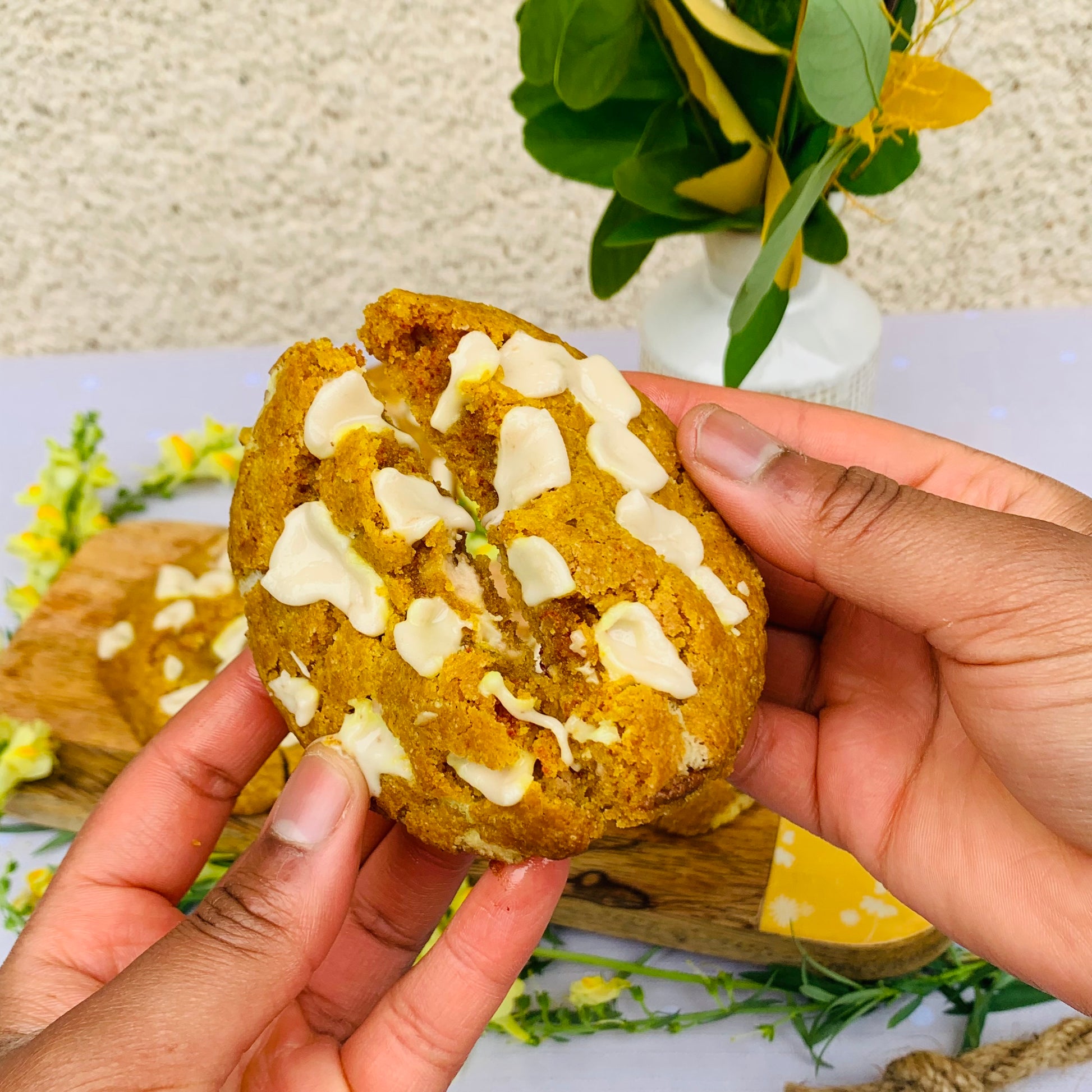 Chaque boîte contient 4 cookies Golden : un cookie aux épices, sa couleur jaune vient du curcuma, avec du chocolat blanc vegan et un cœur de pâte à tartiner coco‑amandes.